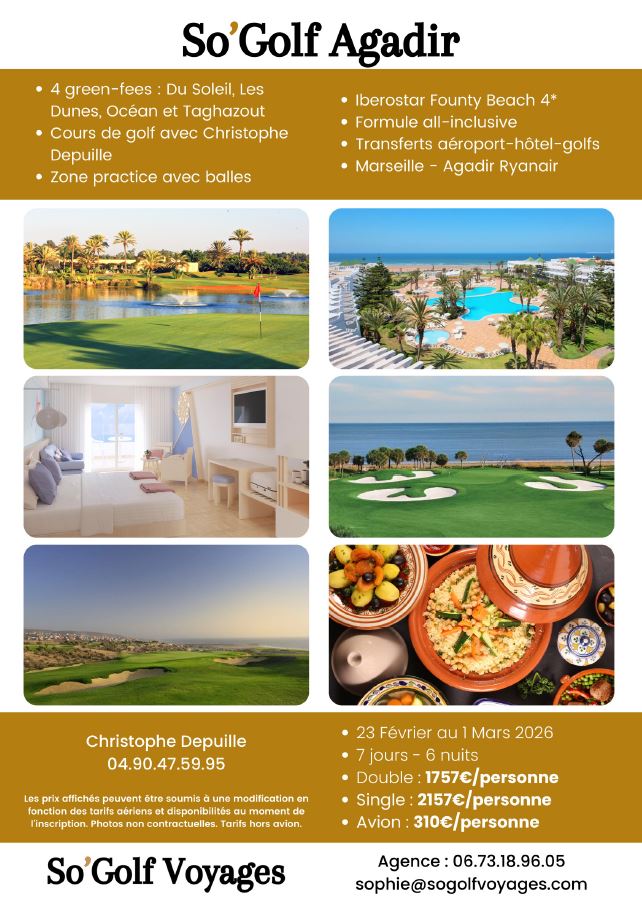 Notre pro Christophe Depuille vous accompagne lors de stages limités à 8 participants, en partenariat avec So’Golf Voyages.